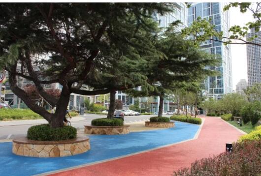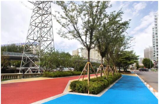 公園建設(shè)遵循“海綿城市”建設(shè)理念,園內(nèi)跑步路徑、休閑活動(dòng)區(qū)、觀景平臺(tái)等硬鋪裝區(qū)域均采用透水混凝土材質(zhì),充分發(fā)揮園區(qū)內(nèi)路徑、廣場(chǎng)對(duì)雨水的吸納、蓄滲和緩釋作用,有效控制雨水徑流,形成自然積存、自然滲透、自然凈化的“海綿路面”。