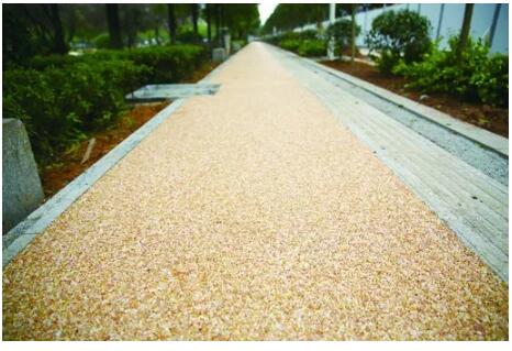 聚氨酯碎石混合料是一種新型路面材料,不僅生態(tài)環(huán)保,還能將天然色的碎石粘結(jié)成極其堅固穩(wěn)定的開放性孔隙結(jié)構(gòu),具有開孔的表面及相互連接的內(nèi)部孔洞,其吸水性極強(qiáng),下雨天不會一踩一腳水。
