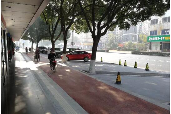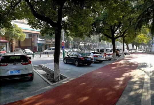 目前道路沿線有條件增設(shè)停車位的地方都已經(jīng)改造一新,改造停車位400余個(gè)。停車位路面根據(jù)不同功能分別鋪設(shè)了透水粒子、水泥磚、草坪磚等;非機(jī)動(dòng)車道鋪設(shè)了彩色瀝青。