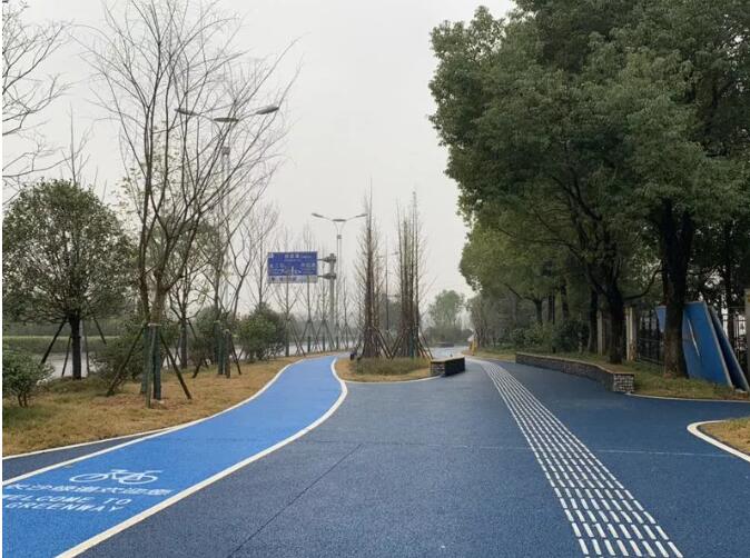 秀峰大道一反往常被筆直規(guī)整的人行道和綠化帶,這條路被白色流線分割開來,顯得蜿蜒曲折,采用深淺不同的藍(lán)色來實現(xiàn)功能劃分,鋪裝的是透水混凝土路面;而街邊的綠化帶普遍下“凹”低于周圍路面,還挖出了一條溝槽。