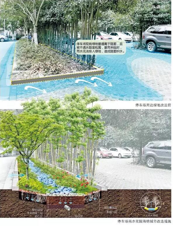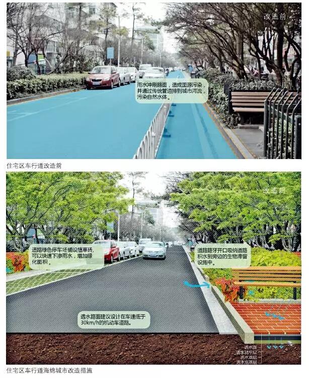 傳統(tǒng)住宅區(qū)中的宅間道路和綠化帶可以改造成透水路面和生物滯留池,用來收集道路上的雨水,避免路面雨水沉積對居民生活造成影響。