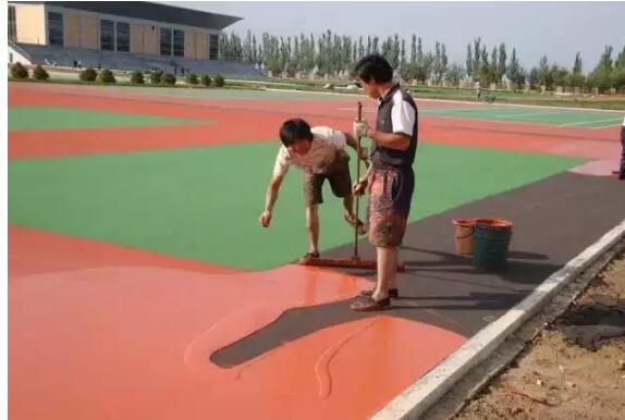 為了增強(qiáng)場(chǎng)地的強(qiáng)度,平整度和使用壽命,將塑膠面層的主要原料丙烯酸和石英砂、水按一定比例攪拌混和成一種乳液,均勻地鋪設(shè)在場(chǎng)地上。