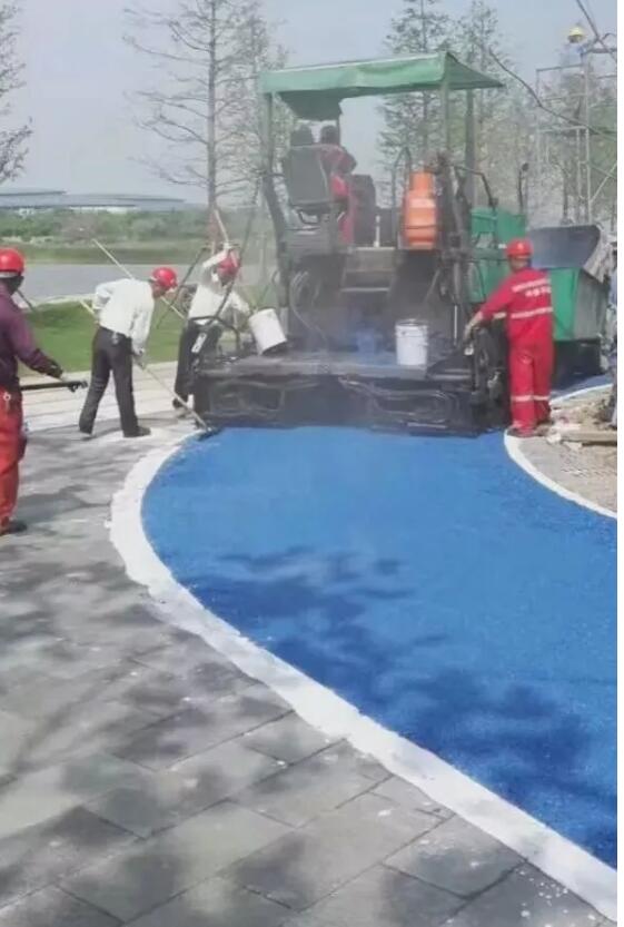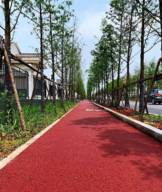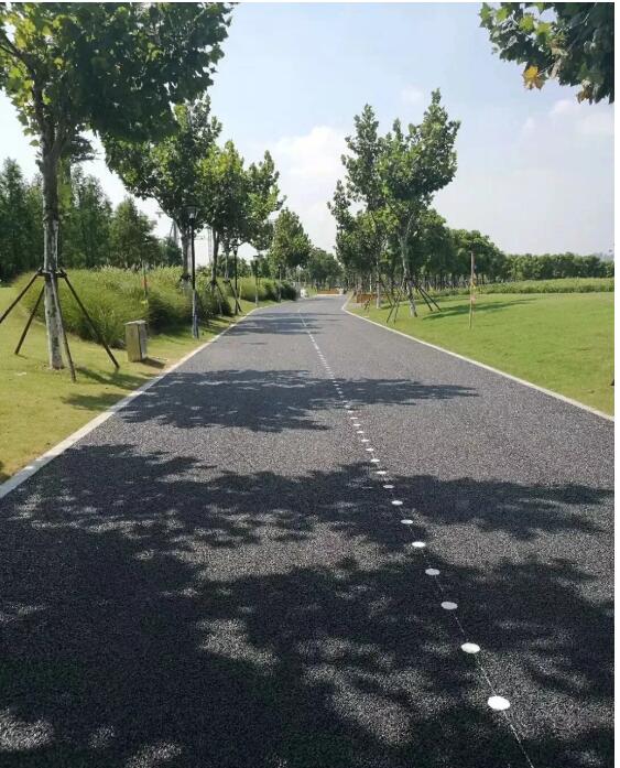 (1)彩色透水瀝青透水路面。用于透水路面的彩色透水瀝青,其黏度高于普通彩色透水瀝青,具有良好的粘附性和彈性恢復(fù),鋪筑的彩色透水路面不僅具有良好的排水性,其多空隙率的結(jié)構(gòu)也起到了很好的吸塵降噪作用。在海綿城市的建設(shè)中,廣泛應(yīng)用在公園市政道路中。