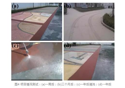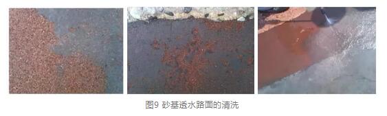 傳統(tǒng)透水混凝土依靠重力式透水,必然需要大量貫通孔徑存在才能保證透水率,因此塵埃極易深入孔洞并堵塞全截面而造成無法清洗恢復(fù);而砂基透水路面因其并不依靠重力式透水,內(nèi)部孔徑<1μm,塵埃無法進(jìn)入透水結(jié)構(gòu)內(nèi)部,有效的解決了上述問題,如圖2是砂基透水路面使用情況,一年后,雖然表面很臟,對(duì)其進(jìn)行簡(jiǎn)單清洗,依然能煥然如新,保持良好的透水性能。