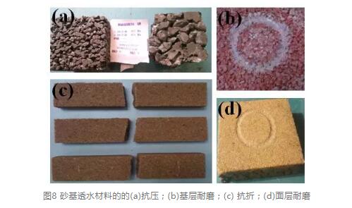 對(duì)砂基透水材料還進(jìn)行關(guān)鍵物理性能測(cè)試,包括抗壓、抗折和耐磨性能測(cè)試。如圖8。通過測(cè)試,其結(jié)果都能優(yōu)于標(biāo)準(zhǔn),表明具有良好的物理性能,可用于路面的鋪裝。