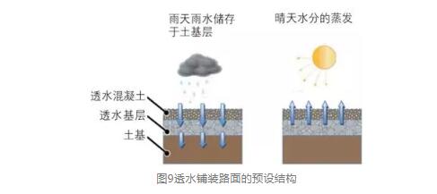 對(duì)于透水路面的設(shè)計(jì),必須滿足以下要求:1,必須具備高透水性;2,必須具備優(yōu)良的抗凍性;3,必須有藝術(shù)裝飾效果;3,能降低噪音;5,整體穩(wěn)定性好;6,安全性能好;7,能調(diào)節(jié)空氣溫濕度,緩解熱島效應(yīng)。為此,預(yù)設(shè)的透水鋪裝路面,基本包括三層。如圖9,包括土基、透水混凝土和透水面層。在雨天時(shí),雨水能從透水面層和基層滲透進(jìn)入土層中,積累起來。而到了晴天熱天,太陽出來時(shí),水分可以從土層穿過透水基層和面層,蒸發(fā)到空氣中,并帶走部分熱量,緩解部分熱島效應(yīng)。
