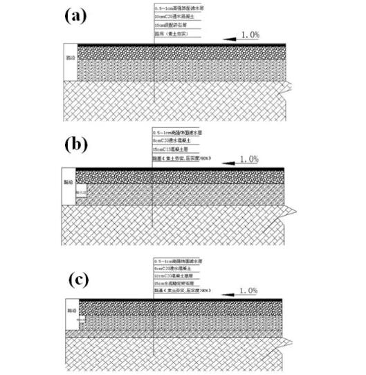 圖10三種常見透水路面鋪裝結(jié)構(gòu):(a)人行路面——全透水結(jié)構(gòu)路面;(b)輕型荷載路面——半透水結(jié)構(gòu)路面;(c)中型荷載路面——半透水結(jié)構(gòu)路面