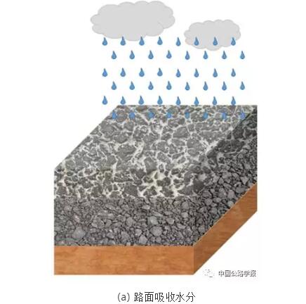 可以通過改變路面材料的熱物理性質(zhì)和路面與環(huán)境的熱交換方式,從而得到具有降溫功能的路面。具體的實(shí)現(xiàn)途徑為,以多孔路面材料為基體,在其孔隙中灌注吸水保水性材料,這種材料具有較好的吸水和保水能力(圖5)。在雨天或者灑水時(shí),能夠吸收水分,當(dāng)環(huán)境溫度較高時(shí),利用路面材料中持有的水分蒸發(fā)來降低路面溫度,減弱熱量在瀝青路面中的積累,改善瀝青路面的熱輻射效應(yīng),可以降低路表和路域的環(huán)境溫度,為道路周圍的的行人和行車提供舒適的環(huán)境,從而起到緩解城市“熱島效應(yīng)”作用。其實(shí)現(xiàn)原理如圖6所示。