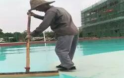 現(xiàn)場(chǎng)調(diào)料:丙烯酸乳液50KG,水泥兩包,80目石英砂3包,108膠水25公斤,加適量水,混合攪拌均勻,倒入施工現(xiàn)場(chǎng),用刮耙將漿液均勻刮涂再場(chǎng)地地面(基礎(chǔ))上,需掛涂2-3遍,待其干固4小時(shí),每一道施工完,干固后打磨平整,再用自來(lái)水試水平,積水處再配底涂混合料補(bǔ)平,直到符合積水率要求。