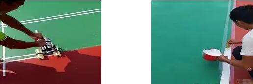 施工方式:按標(biāo)準(zhǔn)尺寸量度定位,標(biāo)出界線位置,用美紋紙沿界線兩邊貼在球場(chǎng)上,用專(zhuān)用劃線漆涂刷于美紋紙間,待表面干后撕掉美紋紙。分兩道涂刷。若球場(chǎng)表面為粗糙面,第一道可加20%面層專(zhuān)用砂涂刷,以防滲邊。