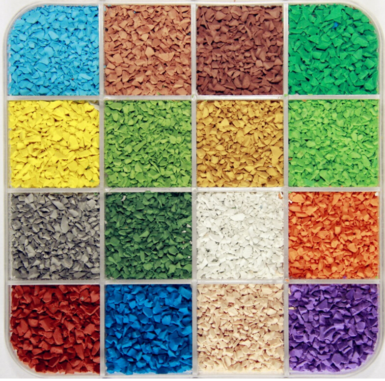 根據(jù)鋪設(shè)面積計算所需半成品,將所需EPDM顆粒和專用膠水分別放置在操作臺合適的位置上。每天施工前制作小樣測試,測試通過后方可