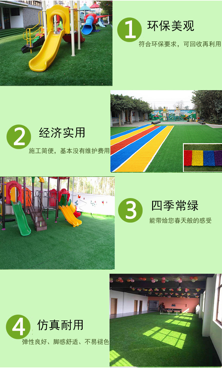 幼兒園人造草坪被廣泛用于幼兒園、以及各類兒童比賽的會場布置、兒童樂園人造草坪的場地布置