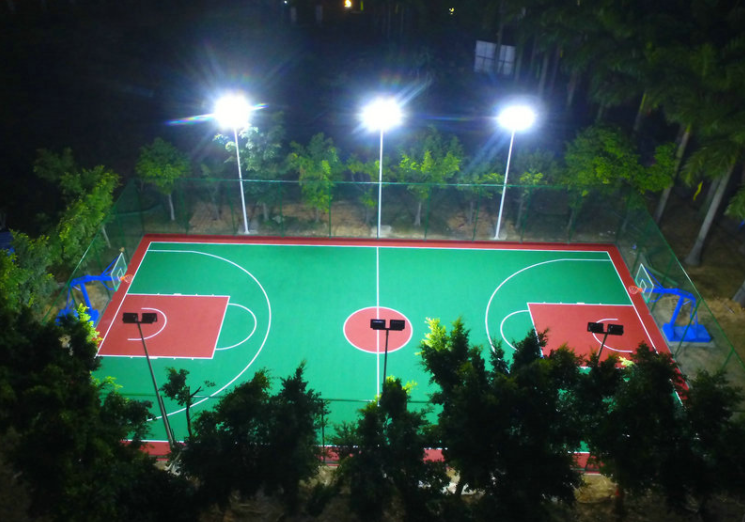 室外籃球場照明一般選用6米7米或8米的錐形鍍鋅管高桿燈,燈具的選擇上以射燈(金鹵燈)或LED燈為主,一個標準的室外籃球場(28*15m)需配置4-6條錐形燈桿,每根高桿燈裝配2-3盞400w金鹵燈,就可以很好的達到戶外籃球場夜晚照明的需求。