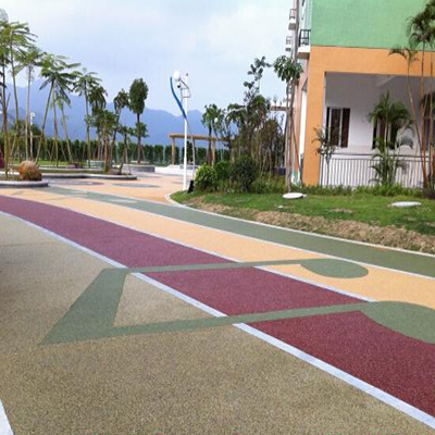 傳統(tǒng)的透水混凝土是由水泥、石子、膠結(jié)劑組成的材料,主要目的是能夠達到透氣透水的效果,較多應(yīng)用于人行道和園林綠道,由于傳統(tǒng)的透水混凝土最終仍然和水泥路面一樣的灰色,所以不能滿足對審美需求較高的人群,即使能夠?qū)ν杆炷吝M行染色,但染色畢竟不能夠持久鮮艷,因此業(yè)內(nèi)人士研究了膠粘石透水地坪。直接使用透明的有機樹脂(膠結(jié)劑)把通過人工篩選的精美天然石子粘結(jié)起來鋪裝在地面上。由于膠結(jié)劑是透明的,所以形成的膠粘石地面就像把石子隨意自然的攤鋪在地上一樣,粒粒清晰可見,而又不會因受到壓力或摩擦而松散,更不會掉色,雨水通過膠粘石地面時也能清楚的看清水是如何被“吸”到地下。